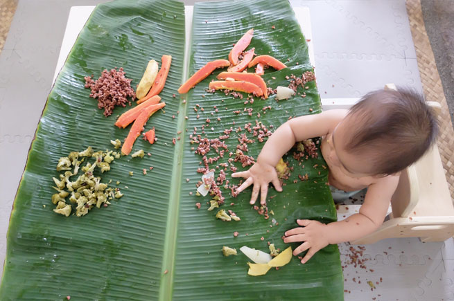 5) Let your child own the experience by ensuring your set-up encourages independence – a weaning chair so the child won’t have to sit on your lap, a low table so they can easily reach the food, etc. Once you’ve prepared the food and showed them their buffet, all you have to do is sit back and relax.