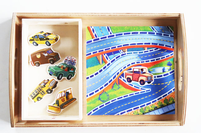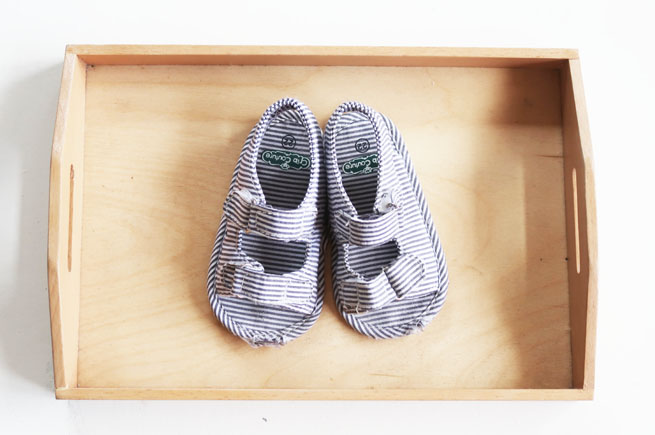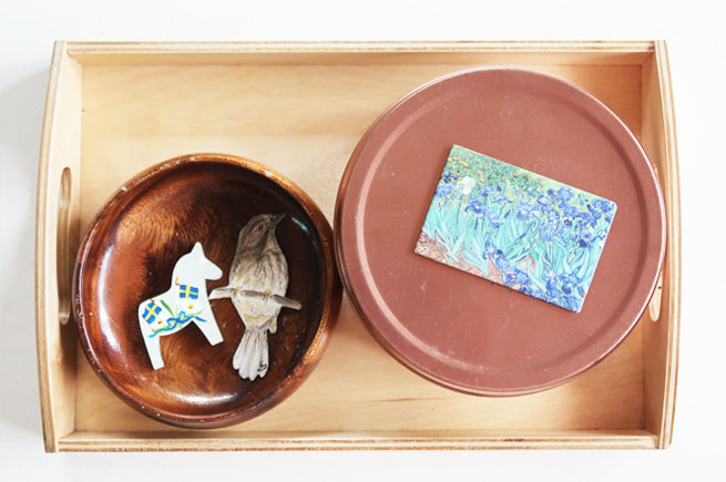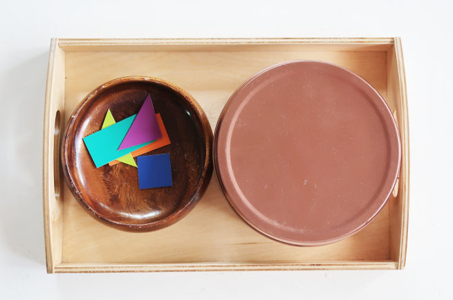 2. MAGNETS — My son loves his magnets! We started with my magnets I collected from our travels (large enough not to be swallowed – this is important because magnets are dangerous when ingested), but I later found magnets of basic shapes from a tangram set from a trip abroad, so that’s what we use. Where can you put magnets? We use regular tin cans (whatever cookie can or candy can I found at home), but you may also use magnetic whiteboards, or you can buy a strip of magnet (a magnet tape) and put it on a board.