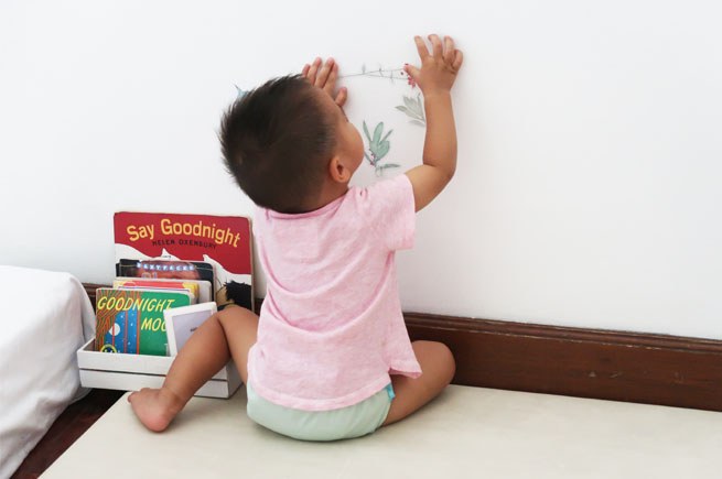 1. WALL DECALS — we have wall decals on some walls so he could peel and put back as much as he likes! I got the flora set from Daiso, and my observation is because of the odd shapes, he sometimes has a challenging time peeling them, and a harder time putting them back, most especially the flowers because they tend to roll on his finger after he has peeled them. But he likes the challenge anyway, so we just leave them there. An easier wall decal would be basic shapes, like the one I had since he was a baby (you may see how ours look like HERE). His round decals are incomplete already, he has already taken off some of them. I just leave them there and wait for him to take them all off. You may get simple shapes of wall decals from White Walls PH.
