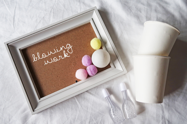 Since we have a lot of small pompoms, I thought they would be great and fun tools for blowing (you can work with table tennis balls, too). You can use a tray to contain them, or like in my photo, we used a small photo frame (glass taken out) just cause it’s not yet used as an actual photo frame.