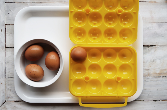 The moment you notice your child putting things from one place to another (like placing some things in the trash can), you can introduce hand transfer work. You can start with solids, like placing eggs in an egg container, or a basket. One of my favorite (just to be clear, MINE, not my son’s) Montessori infant materials is the wooden cup and egg, when the infant first tries to figure out and learn how to fit an egg into a container. Egg transfer work in the kitchen is a great extension for this work. Of course, it doesn’t only apply to eggs, but to anything you have to transfer — groceries to the fridge from the grocery bag, fruits to the blender, vegetables to a bowl, etc.