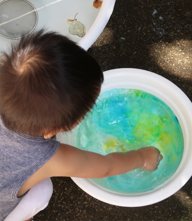 This is one thing my toddler absolutely loves now! I find those liquid food coloring the best for this because all you need is one drop, and as you can see in the photo, the colors mix slowly — so my toddler sees firsthand how the colors change.