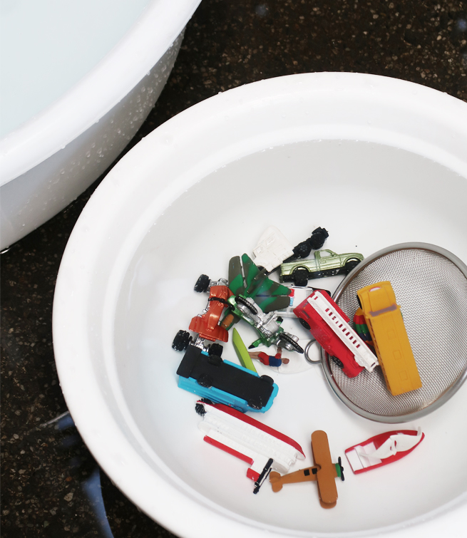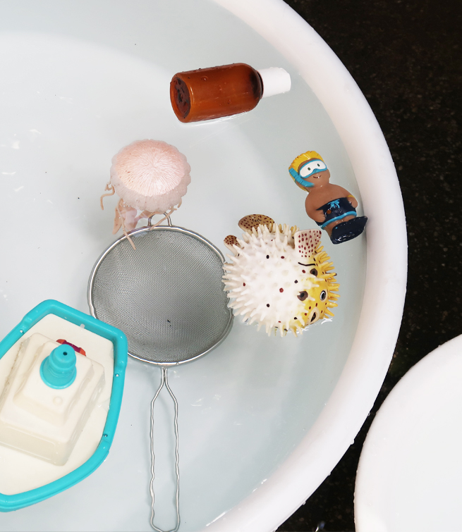* Different objects (that float AND sink like bath toys, pebbles, bottles, leaves, whatever you have at home – do not spend extra on this – just be creative)