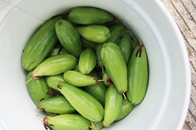After picking, we go straight to washing. Fresh kamias is sticky, which is a great reminder for us to wash. We wash the fruits with a little salt and soak it for a while.